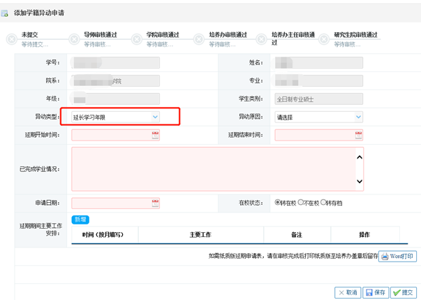 学生本人登录系统——>个人管理——>学籍异动申请,请务必填写已完成学业情况和延期期间主要工作安排: