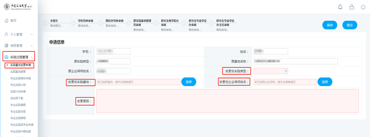 学生在【实践过程管理】→【实践基地变更申请】中提交申请,变更后的实践基地、导师姓名若数据库中没有,则需要学生准确填写(实践基地填全称)。