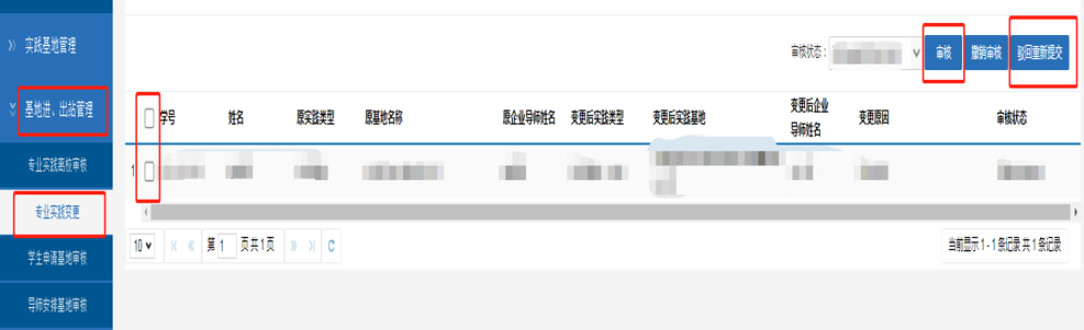 校内导师、校外导师、学院(研究院)教学院长、研究生院专业学位办、研究生院专业学位办主任在【专业学位】→【基地进、出站管理】→【专业实践变更】界面勾选、审核/驳回。