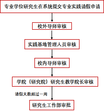 专业学位研究生在专业实践期间,因病或其他原因,需要暂时离开研究生联合培养基地,请假一周以上,须在研究生信息管理系统“实践过程管理”模块的“专业实践请假”栏目中点击“新增”按钮,填写、提交请假申请。按照学籍管理规定,最长时间不得超过一个月,须请假审批成功方可离开工作站,具体工作流程如下: