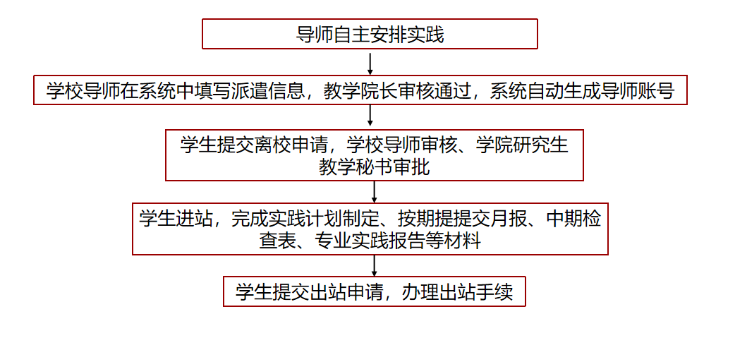 在【实践过程管理】-【导师自主安排实践申请】中进行申请,填写单位信息、企业导师信息,上传在研项目合同等相关材料;同时安排学生(同一个申请只能安排同一个学院的学生);