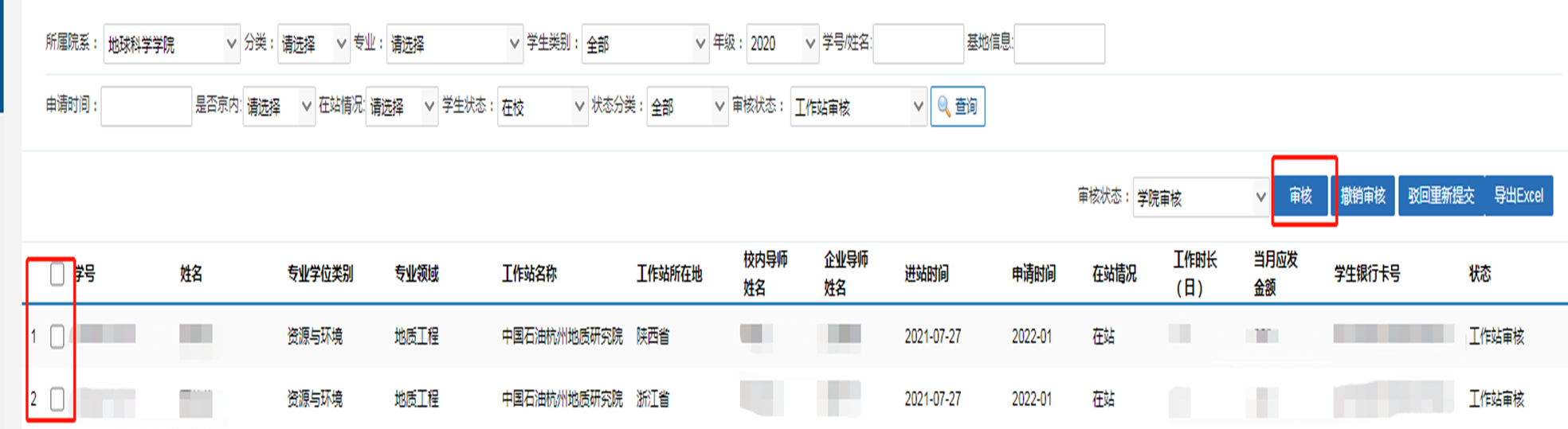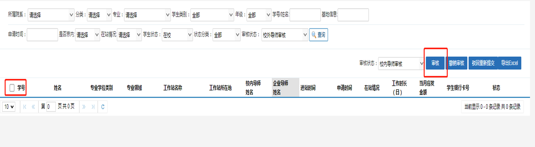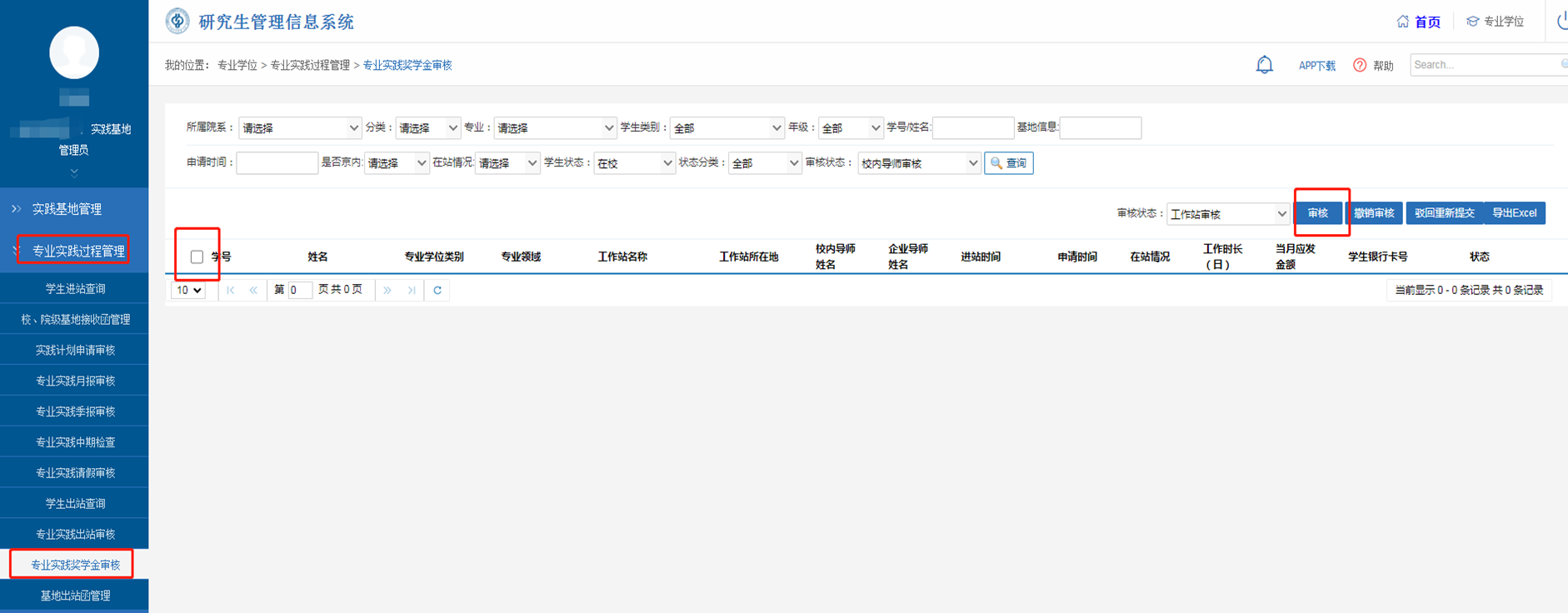 在“专业实践管理→专业实践奖学金审核”界面, 根据学生实际在站情况,勾选审核;