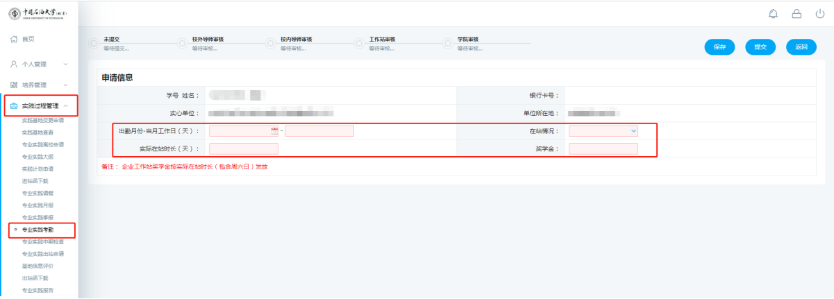 在“专业学位→实践过程管理→专业实践考勤”界面维护实际在站信息(包含周六日);