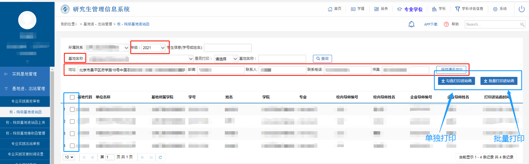 院办秘书在【专业学位】-【基地进、出站管理】-【校、院级基地进站函】界面为即将进站学生打印进站函,需维护并保存通讯地址,勾选需要打印的学生(可单独打印也可批量打印)。