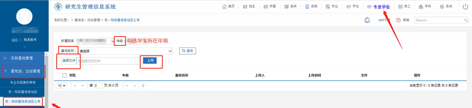 院办秘书在开具后的进站函上盖章后,可在【专业学位】-【基地进、出站管理】-【校、院级基地进站函上传】界面模块中上传。