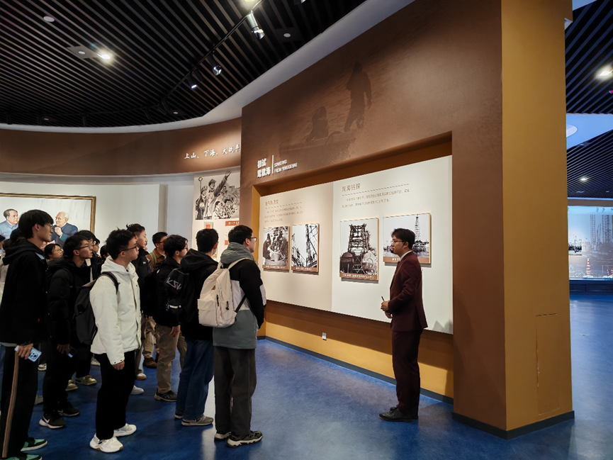 师生一行首先来到了中国海洋石油工业陈列馆。在第一个展厅里,讲解员带领大家穿越到了那个“这也缺那也缺,就是不缺激情”的峥嵘岁月,大家怀着景仰的心感受着海油前辈战风暴、迎巨浪、抗海冰,百折不挠为祖国找石油的艰辛创业历程。